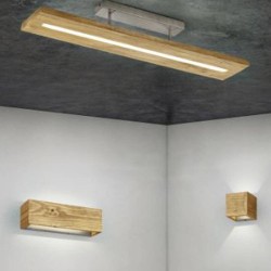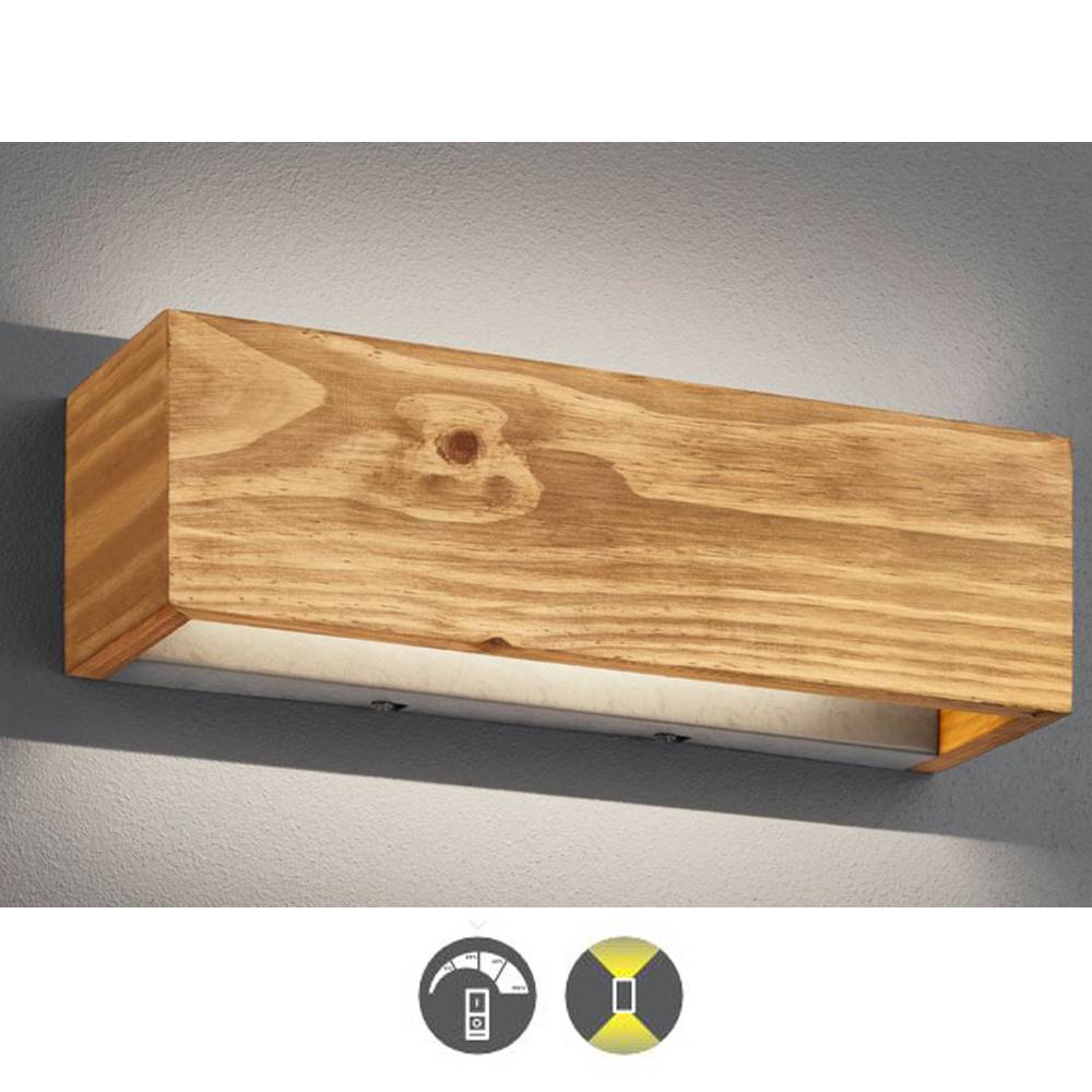 Aplique Brad. Su forma es rectangular y está fabricado en madera color natural. Lleva integrada una placa led de 13.5w consumo (1500lm) en tonalidad 3000k (luz cálida).Emite luz hacia arriba y hacia abajo. El aplique Brad es regulable en intensidad (3 intensidades) mediante el pulsador de nuestra casa. Brad es ideal para utilizar en cualquier estancia de estilo moderno e incluso de estilo rústico.
