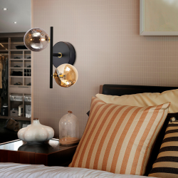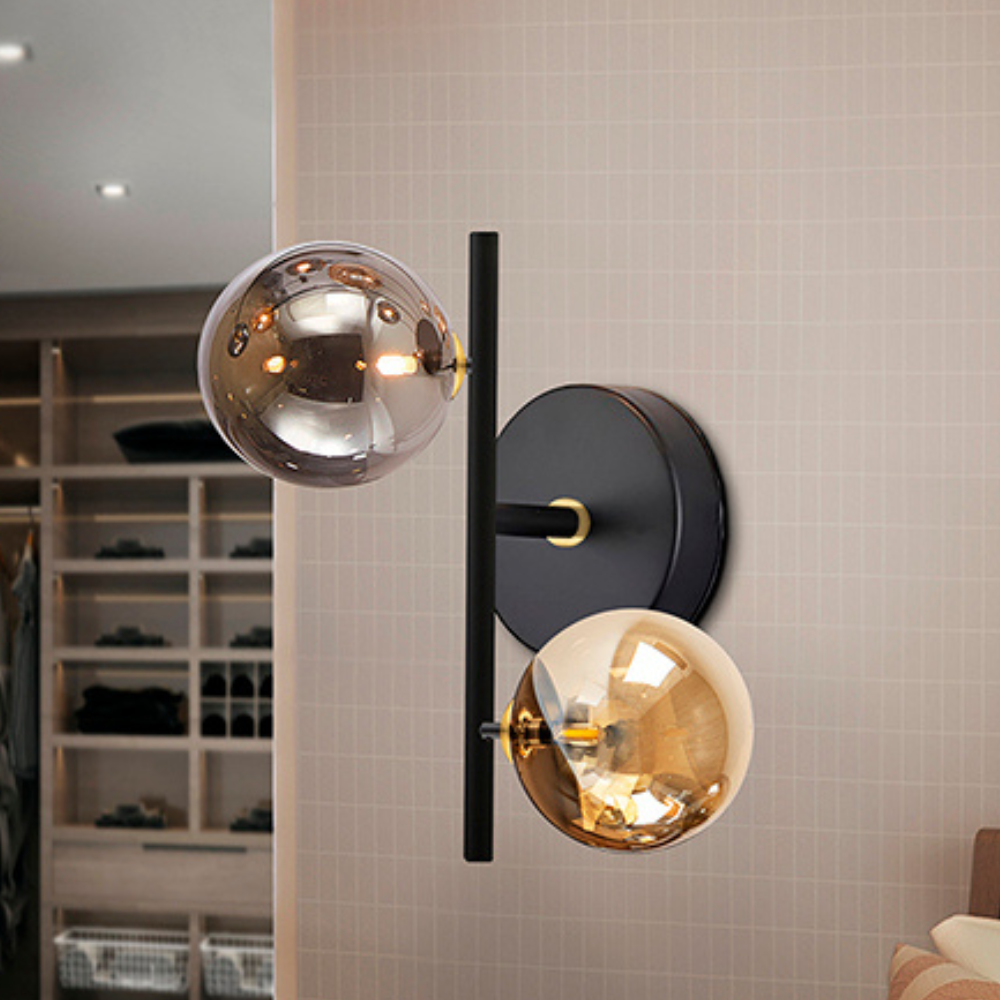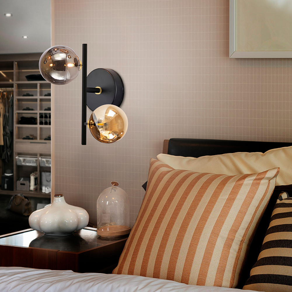 Aplique de pared Dark de Schuller con dos luces G9 LED incluidas. Diseño moderno en metal negro mate con detalles en latón satinado y tulipas esféricas de cristal ámbar y smoke. Iluminación cálida ideal para salón, dormitorio, pasillo u oficina. Fácil instalación y estilo contemporáneo.