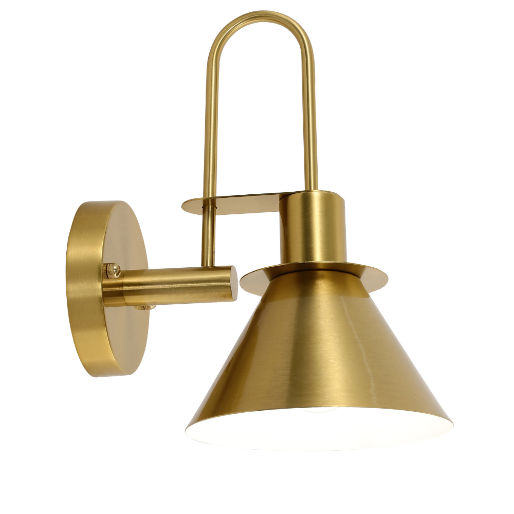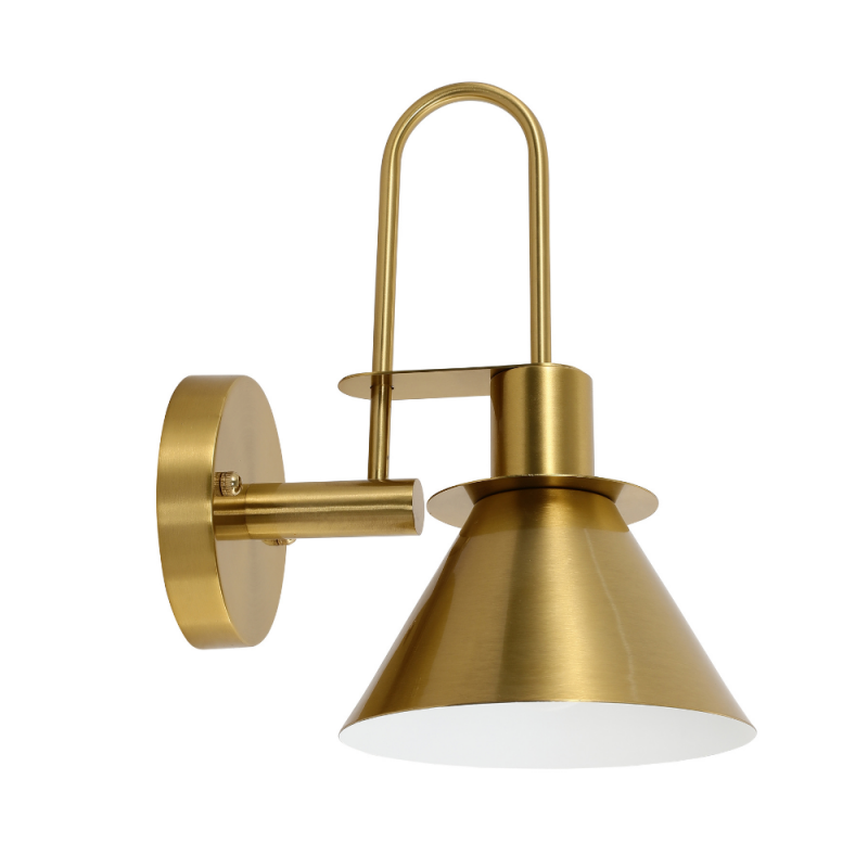 El aplique de pared Hakuba 1xE27 con acabado dorado y pantalla cónica ofrece una iluminación elegante y decorativa ideal para salones, dormitorios o pasillos.