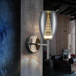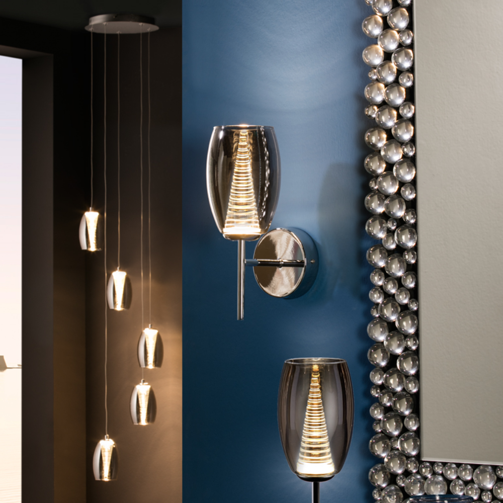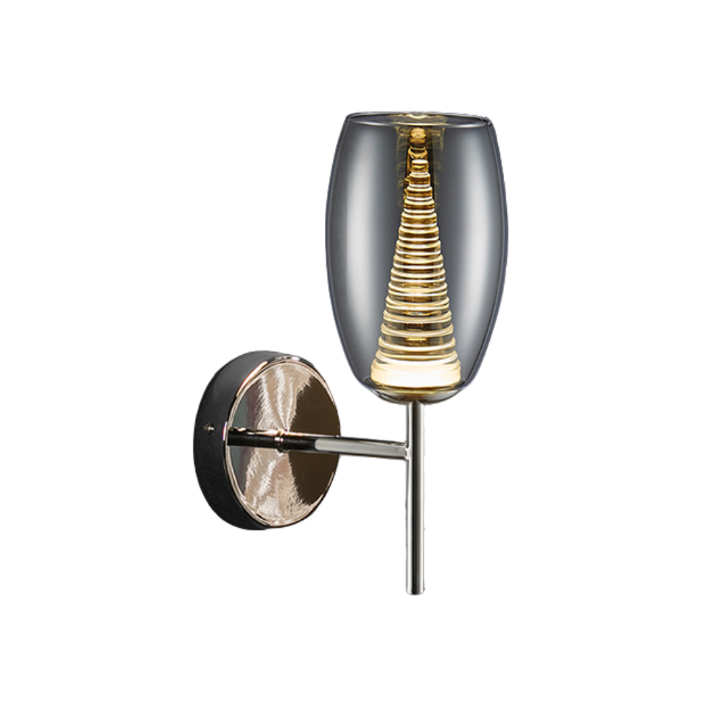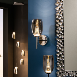 Aplique de pared Nebula con diseño moderno en cromo y cristal espejado. LED integrado 5 W (450 lm) con luz cálida 3000 K. Tulipa doble con difusor interior de policarbonato para una iluminación suave y decorativa en interiores. Ideal para salones, dormitorios o pasillos.