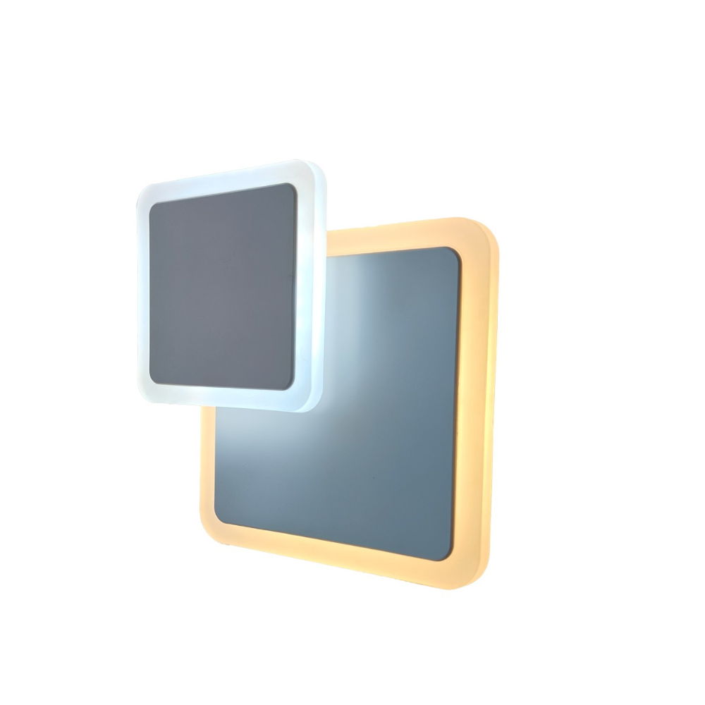 Aplique de pared Sofia LED 12W (900 lm) con luz CCT 3000–4000K (cálida + neutra combinadas) y placa LED central móvil para crear distintas composiciones. Acabado blanco, difusor PMMA opal, haz 120°, IP20. Medidas 184×184×53 mm