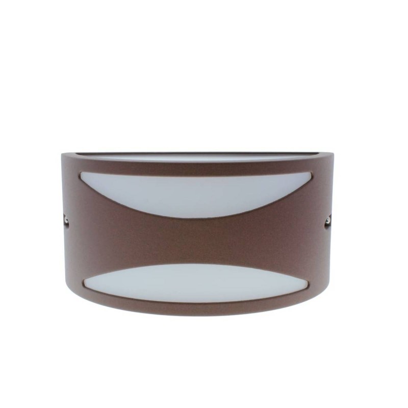 Aplique de pared modelo Mint. Su estructura está realizada en aluminio fundido en tono marrón óxido. Difusor de PC en acabado blanco. MInt es compatible con bombillas led (no incluidas). Emite luz hacia arriba, abajo y al frente. Tiene un nivel de protección IP54 y se puede utilizar para la iluminación en exteriores sin problema.