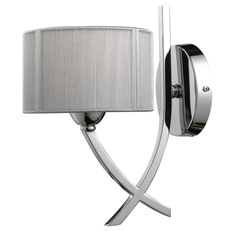 Aplique realizado en metal cromado con pantalla de hilos de seda en color plata.Compatible con bombillas led ( Bombilla led no incluida).Ideal para cabeceros de dormitorio. Disponible en 2l.