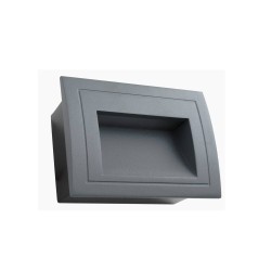Baliza de empotrar para pared de uso interior y exterior para iluminar frontalmente y hacia abajo. Nivel de proteción IP-54. Material aluminio gris oscuro.Led integrado de 6w consumo y tonalidad 3000k (luz cálida).Gracias a su diseño es un empotrable ideal para señalizar. Disponible en tonalidad 4000k (luz neutra) y en acabado gris oscuro.
