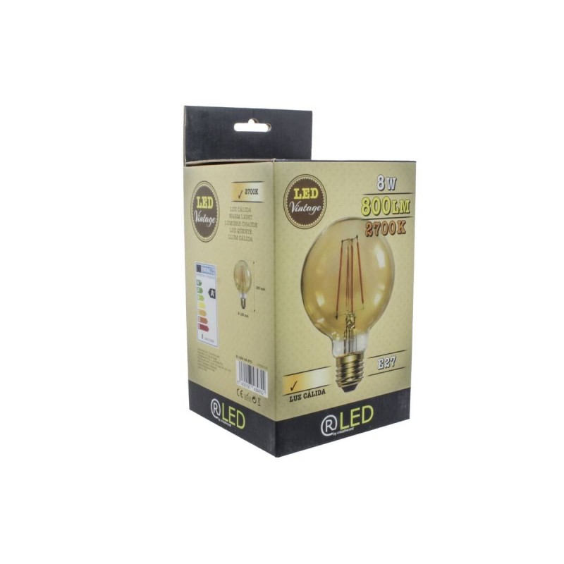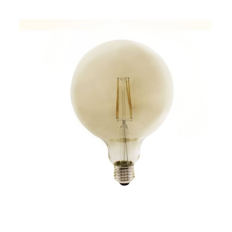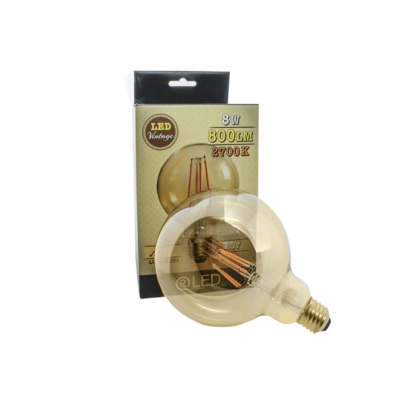 Bombilla de led formato globo. Su estructura es de cristal acabado caramelo. Tiene un consumo de 8w (800lm). Su tonalidad es de 2700k (luz cálida).Su casquillo es E27. Esta bombilla de estilo Vintage es ideal para decorar e iluminar cualquier estancia.