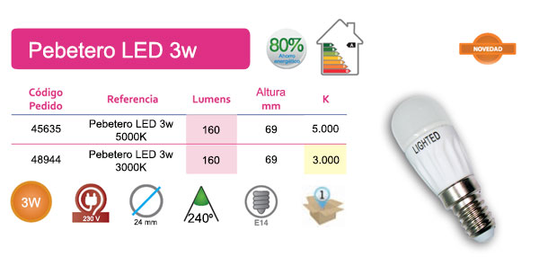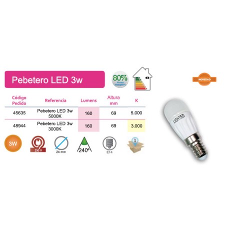 Pebetero LED de 3W con la que conseguiras un Ahorro Energetico del 80%, gracias a su tecnología, diseño y gran ángulo de iluminación 240º. Sustitución directa de las bombillas tradicionales. Vida útil 30.000 horas. No regulable. No direccional. Luz Blanco Cálido 3000K 160 lúmenes.