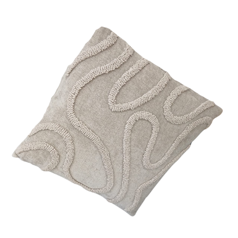 Cojín decorativo poliester y algodón . 45 × 45 cm con relleno incluido. Funda en tono beige/natural con relieve texturizado en forma de líneas orgánicas, ideal para sofás, camas o butacas de estilo nórdico, boho o neutro.
