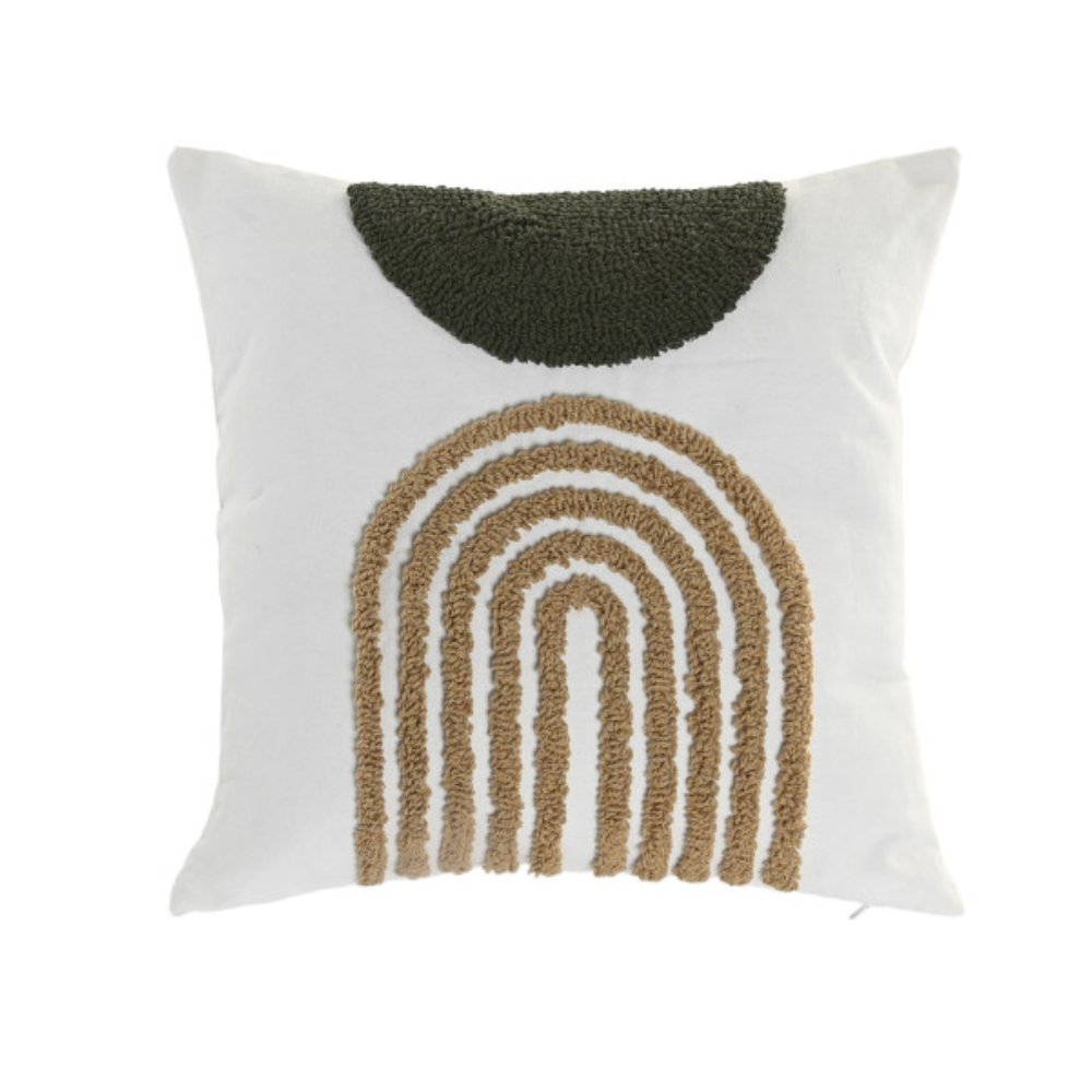 Añade textura y estilo nórdico a tu sofá o cama con este cojín cuadrado en blanco con aplicaciones en relieve: arco geométrico en tono beige y media luna verde en la parte superior.DetallesMedidas: 45 × 45 cmMaterial: poliéster (420 g aprox.)Color base: blancoAcabado: aplicaciones textiles en relieve de tacto suaveUso: salón, dormitorio o butacas