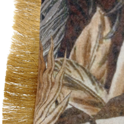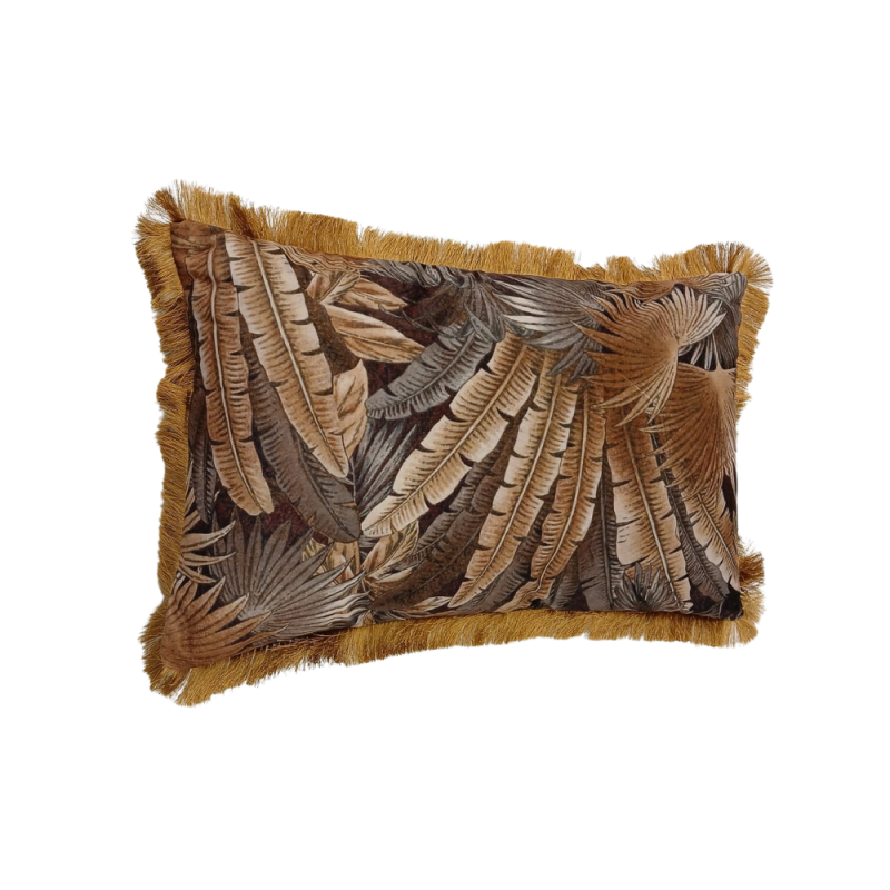 Cojín decorativo 50X30 cm con relleno incluido. Diseño tropical de hojas de palmera en tonos tierra y nude sobre fondo neutro, rematado con fleco perimetral color mostaza que le da un aire boho-exótico.