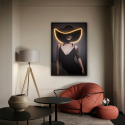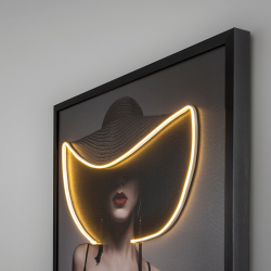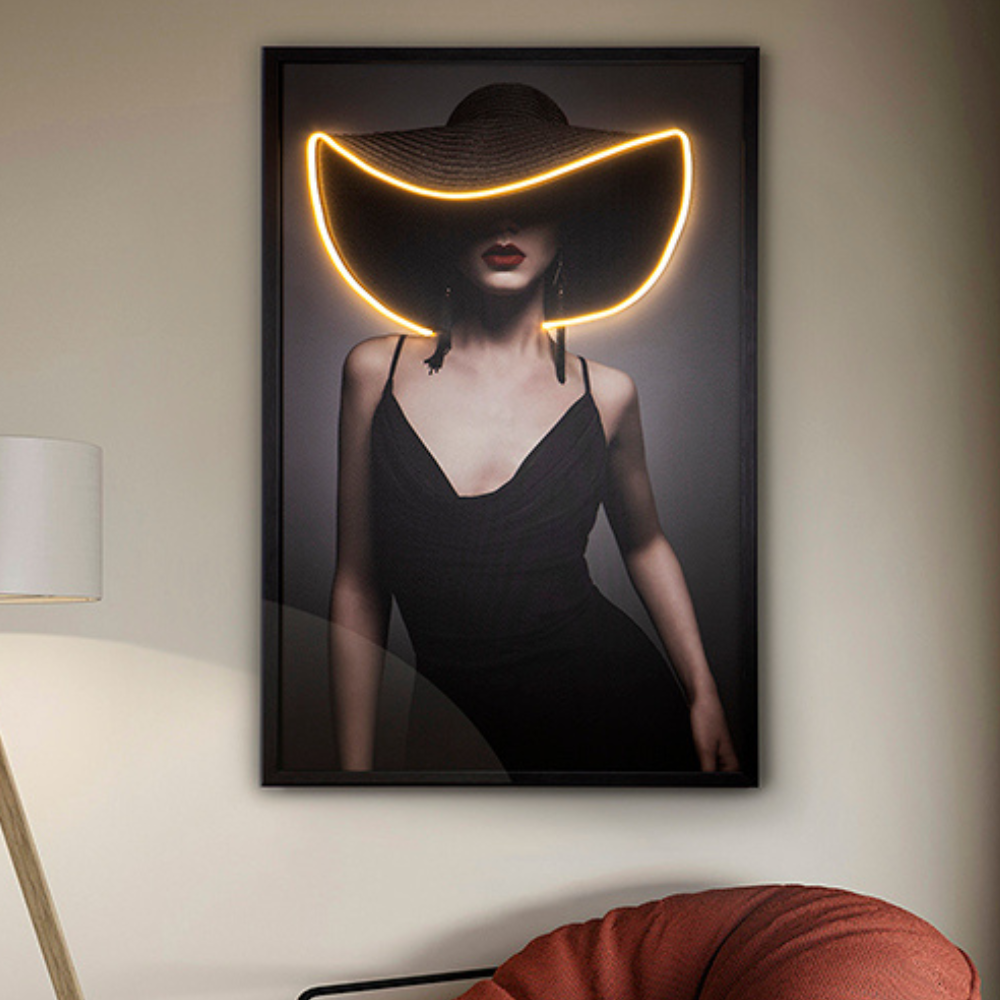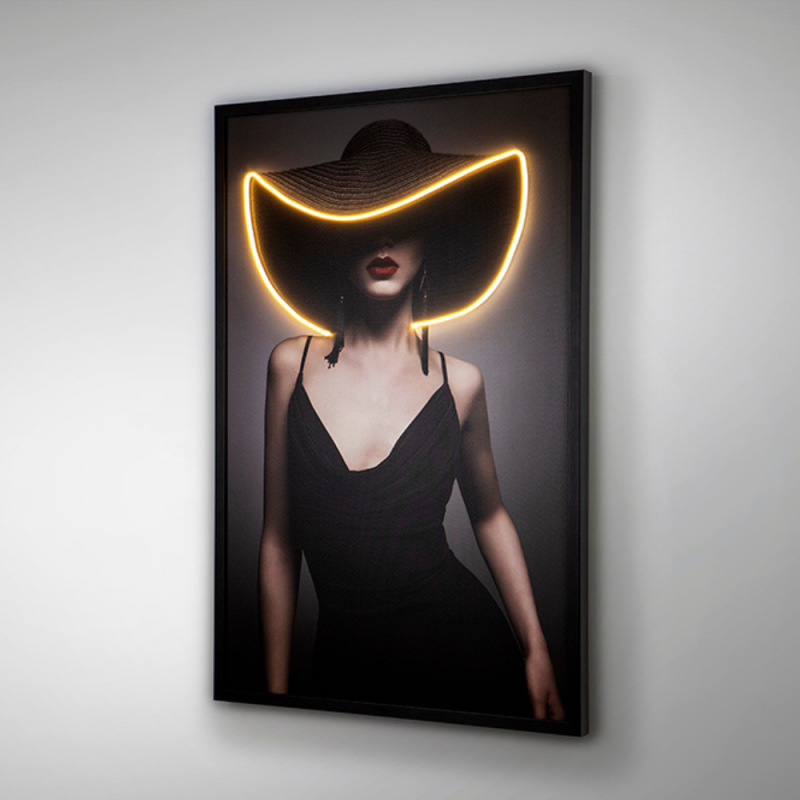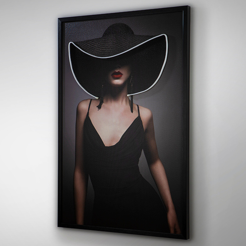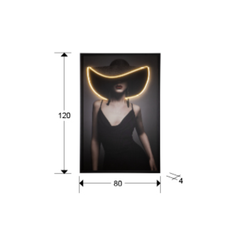 Cuadro con luz LED Schuller Pamela lienzo impreso sobre DM y marco negro, con tira LED decorativa integrada. Incluye caja de conexiones, enchufe e interruptor. Medidas 80×120×4 cm y 5 kg.