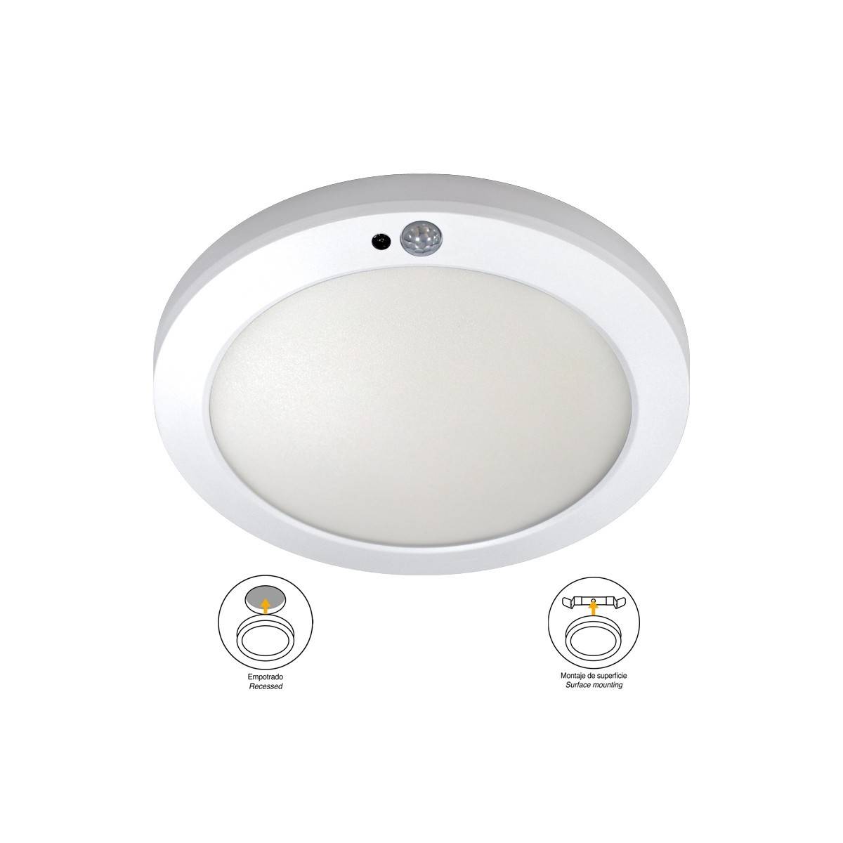 El empotrable Tekia es muy versátil ya que se puede instalar como un empotrable, ajustándose al agujero que tengamos (min. 6.5cmØ hasta 20.5cm Ø) gracias a sus pestañas ajustables o se puede instalar como un plafón de superficie. Lleva integrada una placa led de 18w consumo (1620lm) y dispone de las 3 tonalidades de luz (3000k 4000k 6000k) que previamente a la instalación podremos elegir. Incluye un sensor de movimiento y sensor crepuscular que puede funcionar con luz o sin luz y tiene un ángulo de detección de 120º. Si desea cambiar el acabado en negro o color plata puede hacerlo mediante unos marcos (no incluidos).