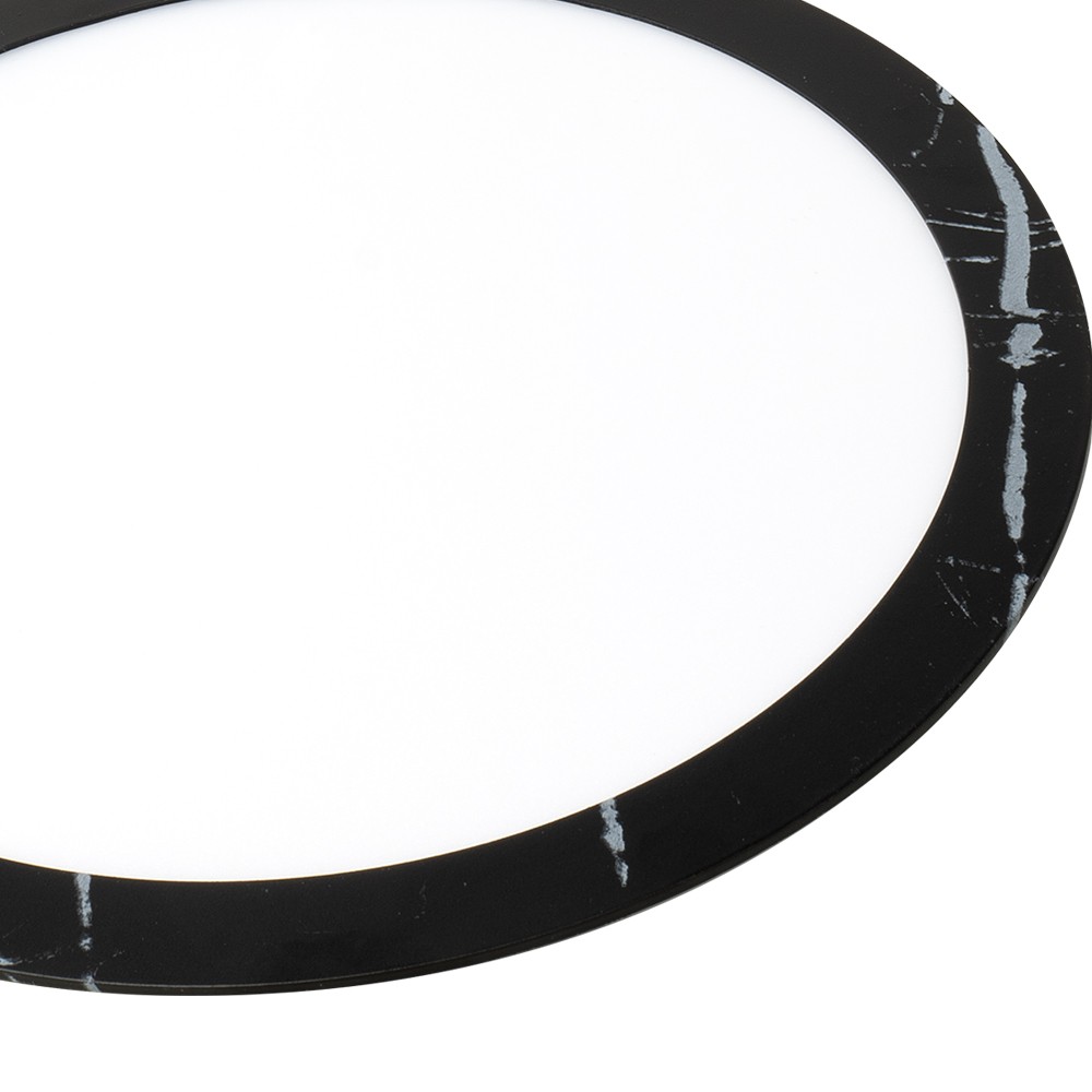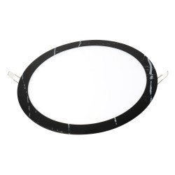 Downlight Circular "Betas Negro". Diseñado para una instalación empotrada, este downlight destaca por su acabado en metal negro complementado con betas blancas que simulan el efecto del mármol. Incorpora un difusor de PVC en color blanco y está equipado con una placa LED integrada de 30w, proporcionando una luminosidad de 3210lm. Su luz despliega una tonalidad neutra de 4000k y se extiende en un haz de 120º. Para su instalación, se necesita un orificio de corte de 28.5mmØ. El modelo "Betas Negro" se ofrece también en diversas variantes de acabados y tamaños. Es una elección óptima para iluminar cualquier espacio que permita una luminaria empotrada.