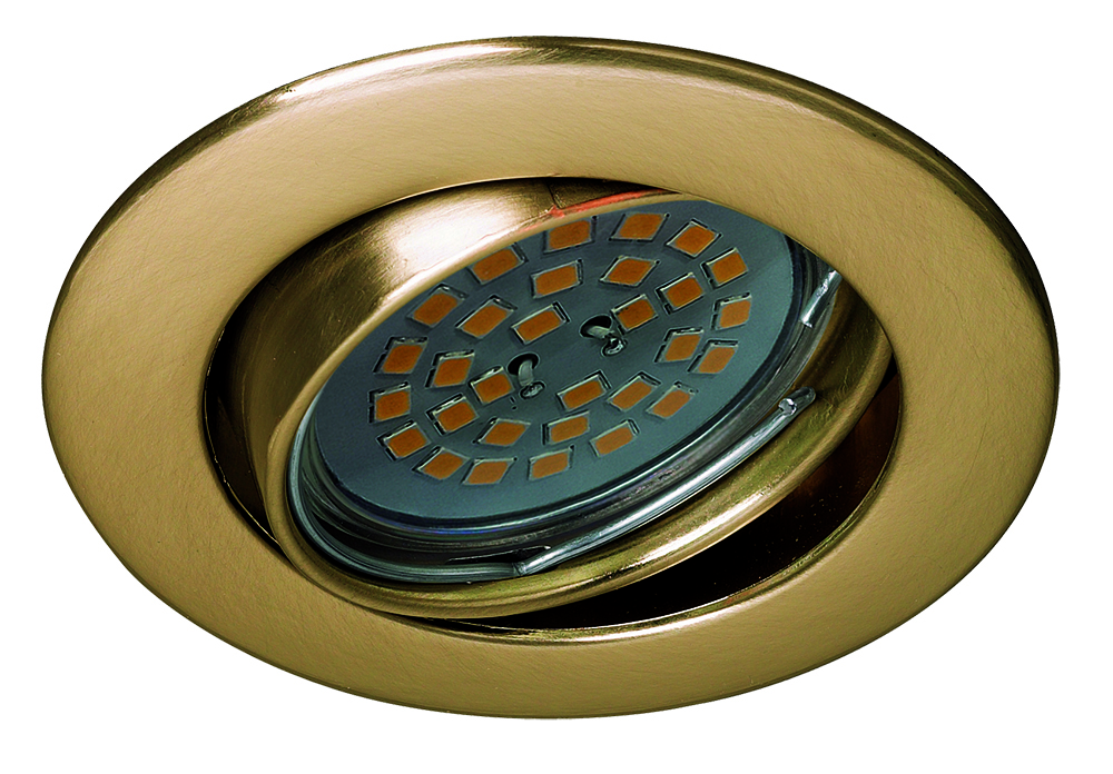 Foco empotrable Zar redondo basculante en estructura de aluminio en acabado oro viejo. Necesita un agujero de 7,5cm para su instalación. (compatible con bombillas led ) Bombilla no incluida.