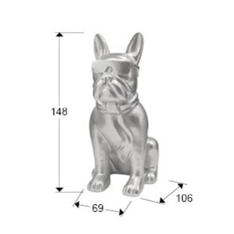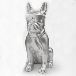 Original figura de un Bulldog Francés en tamaño XXL. Está realizado en fibra de vidrio y poliéster. Está decorado con pintura en acabado plata. Esta figura es apta para utilizar en la decoración de interiores y exteriores.