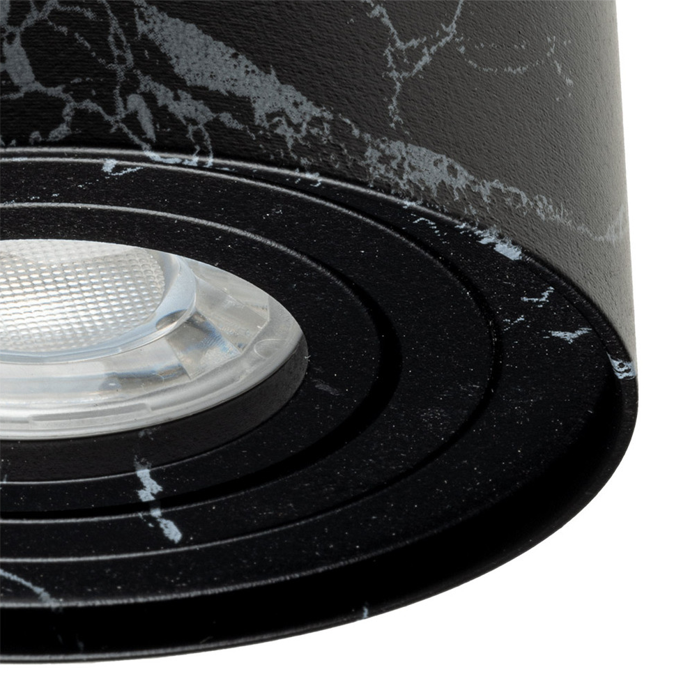 Foco de superficie basculante Aros. Estructura redonda Ø96×125 mm en acabado mármol negro, compatible con bombilla GU10 (no incluida). Ideal para iluminación direccional y acento en interior.