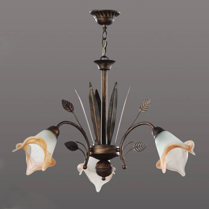 Lámpara de estilo clásico de 3l en acabado marrón forja y tulipas de cristal en blanco mate con los filos en color ambar. Compatible con bombillas led (no incluidas). Disponible en colgante de 5l y sobremesa.