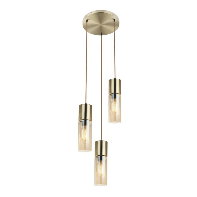 Lámpara colgante Annika oro 3L. Su estructura es de metal acabado cuero ((latón mate) su cable es de textil marrón y sus tulipas de forma cilíndrica están formadas por metal y vidrio en acabado ámbar. Annika es compatible con bombillas led (no incluías), os recomendamos utilizar bombillas de estilo vintage, transparentes de filamento en luz cálida. La altura de sus tulipas es regulable a la hora de la instalación. Annika es ideal para la iluminación en una estancia de estilo moderno e incluido en algunos ambientes de estilo vintage. La serie Annika esta compuesta por varios formatos de lámparas, échale un vistazo!!