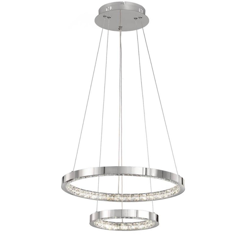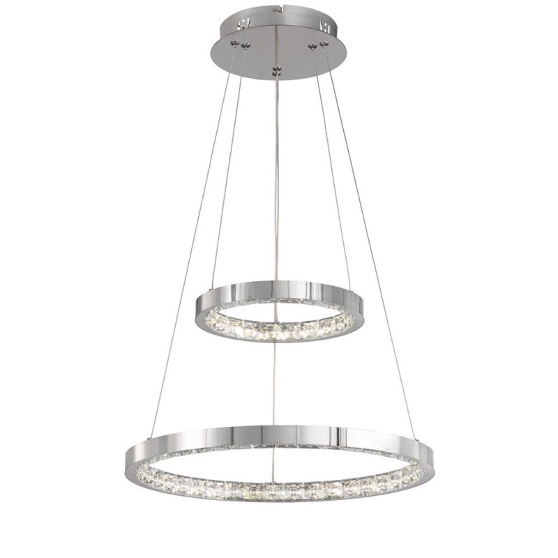 Lámpara colgante modelo Bohemia. Bohemia está formada por dos aros de acero inoxidable en acabado cromo y pequeños cristales transparentes con forma cuadrada. La lámpara Bohemia tiene un consumo de 27w led (1890lm) y una tonalidad 4000k (luz neutra). Sus dos aros son regulables en altura lo que nos permite crear diferentes diseños. Bohemia es ideal para estancias de estilo moderno.