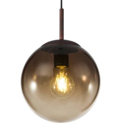 Lámpara de colgante Varus 1L ámbar. Lámpara de estilo moderno y sencillo. Su estructura es de metal acabado marrón, cable negro y tulipa con forma de esfera de vidrio, mitad marrón efecto espejo y mitad ahumado. Varus es compatible con bombillas led (no incluida), os recomendamos utilizar bombillas led formato transparente. Su altura es regulable a la hora de la instalación, podremos adaptarla a la medida que deseemos. Varus es una serie muy completa con diferentes formatos de lámparas.