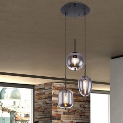 Lámpara colgante modelo Blacky fume 3L. Si busca una lámpara original la lámpara Blacky fume 3l es perfecta. Su estructura redonda es de metal en color negro, las tulipas son de vidrio ahumado con diferentes formas. Es compatible con bombillas led (no incluidas). Su altura es regulable a la hora de la instalación en cada una de sus tulipas para poder adaptarla y crear un diseño a nuestro gusto. Blacky fume 3L es ideal para utilizar en estancias de estilo moderno, y amplias como por ejemplo un salón. Blacky es una serie que está disponible en diferentes formatos.