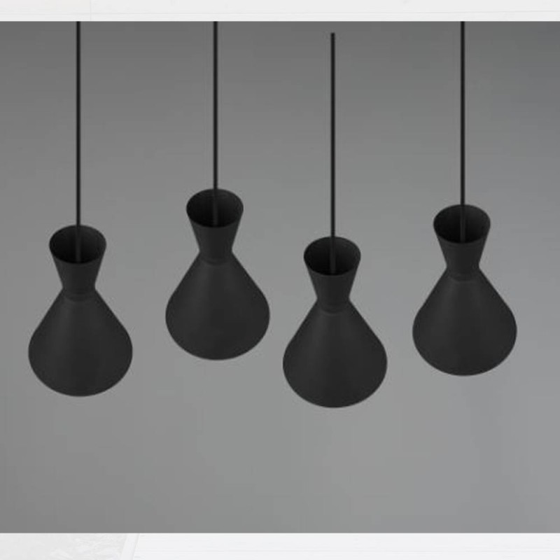 Lámpara colgante 4L Enzo. Su estructura es de metal en acabado negro. Cable de color negro y tulipas de metal en acabado negro e interior color blanco. La altura de las tulipas es regulable a la hora de la instalación. Enzo es compatible con bombillas led (no incluidas). El estilo de Enzo es moderno, pero podemos adaptar perfectamente es estancias de estilo Vintage. La lámpara colgante Enzo es ideal para utilizar encima de una mesa o par la iluminación de una barra. Disponible en diferentes formatos.