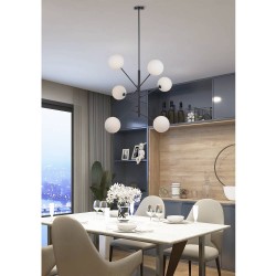 Original lámpara que se compone de una estructura de metal en color negro mate y tulipas con forma de esfera en acabado cristal opal. Como mínimo su altura es de 48 cm pero puede variar al igual que su diámetro ya que cada brazo, se puede orientar a la hora de su montaje hacia donde se desee, dando forma la forma que deseemos a la lámpara. Es compatible con bombillas led (no incluidas).Disponible en versión de 8l. Las tijas son desmontables y la altura puede variar -48 cms con el cuerpo directo a la base de techo -78 cms colocando solo una tija -108 cms colocando las dos tijas