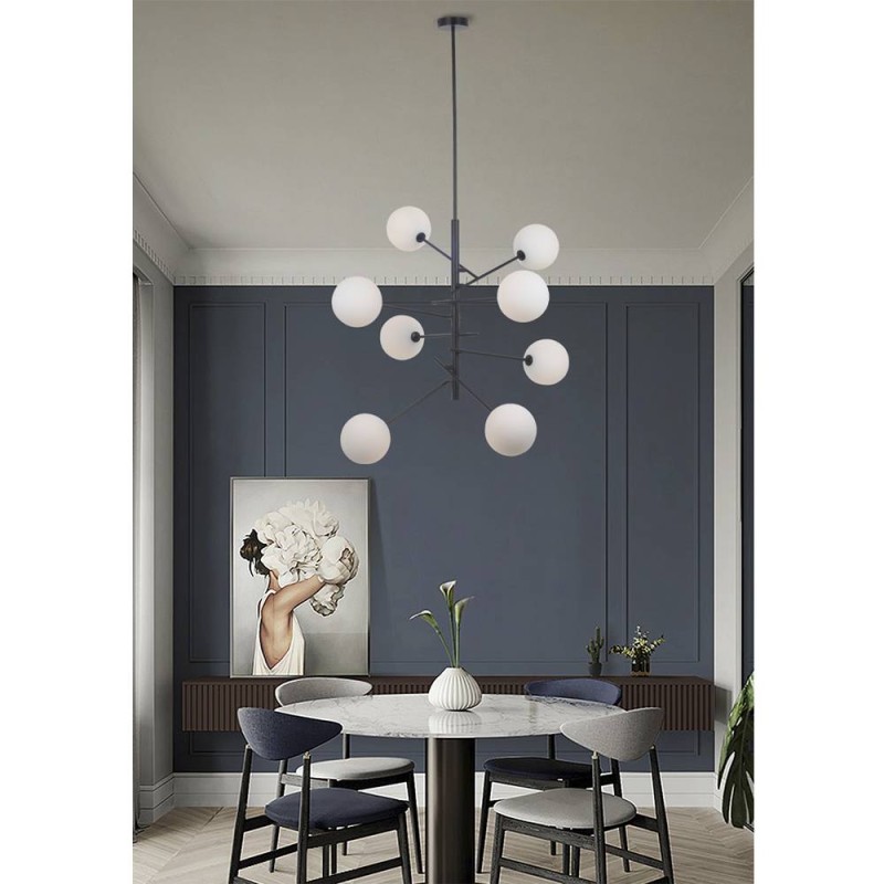 Original lámpara que se compone de una estructura de metal en color negro mate y tulipas con forma de esfera en acabado cristal opal. Como maximo su altura es de 120cm pero puede variar al igual que su diámetro ya que cada brazo, se puede orientar a la hora de su montaje hacia donde se desee, dando forma la forma que deseemos a la lámpara. Es compatible con bombillas led (no incluidas).Disponible en versión de 6l.