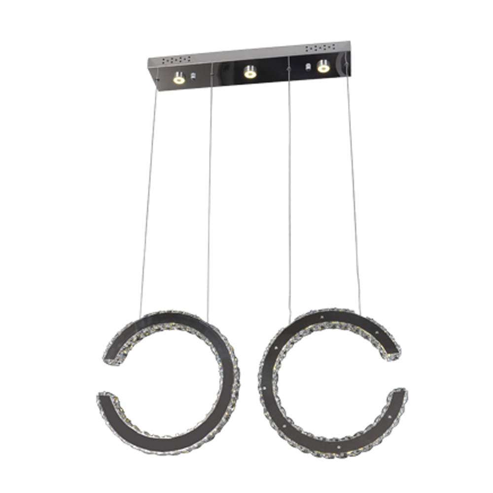 Lámpara colgante en acabado metal cromado y tulipa con forma de C compuestas por cristales transparentes. Led integrado con un consumo de 34w.Incluye mando a distancia y 3 tonalidades de luz (3000k 40000k 6000k).Altura regulable a la hora del montaje. En su base incorpora 3 focos que incrementan la luminosidad de lámpara y junto con la luz que emiten las tulipas, hacen que esta lámpara sea la opción ideal para iluminar un salón o dormitorio.