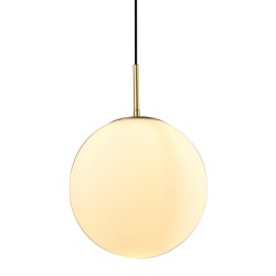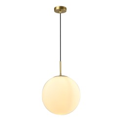 Lámpara colgante 'Bola': diseño moderno en metal dorado y cristal blanco opal para una iluminación suave y eficiente. Altura ajustable y disponible en varios tamaños.