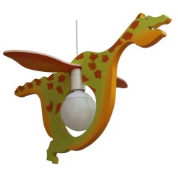 Lámpara infantil de madera, diseñada en forma de dragón en colores verdes y amarillos.Compatible con bombillas incandescentes , bajo consumo o led (bombilla no incluida). Regulable en altura.