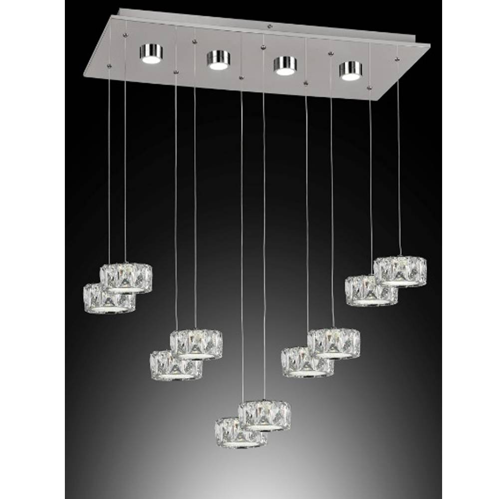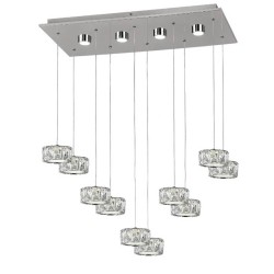 Lámpara de techo Elegance 10L. Su estructura es de acero inoxidable en acabado cromado. Sus tulipas están formadas por pequeños rectángulos de cristal transparente y Pvc efecto brillo. La altura de sus tulipas es regulable a la hora de la instalación. En su base rectangular incluye dos pequeños led circulares. Su iluminación es led y tiene un consumo de 96w. Su tonalidad de luz es de 4000k (luz neutra). Este tipo de lámpara es ideal para la iluminación de una mesa de comedor. Elegance es una colección muy extensa y dispone de diferentes formatos.