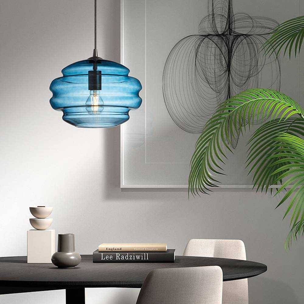 Lámpara de techo modelo Mel XL. Tiene un diseño muy original . Su estructura es de metal negro. Cable en color negro. Su tulipa tan original es de cristal acabado azul. Su altura es regulable a la hora de la instalación. Compatible con bombillas led (no incluida), os recomendamos utilizar bombillas led de filamento visto. Mel XL es ideal para utilizar en cualquier estancias de estilo moderno. Disponible en un tamaño inferior de 30cm Ø y en acabado cristal transparente con soporte en cromo mate o en acabado cristal ámbar con soporte en oro envejecido.