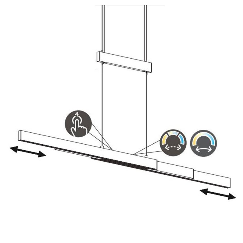 Lámpara colgante Trajan. La peculiaridad de esta lámpara colgante es que es regulable en altura y también extensible en anchura, permitiendo adaptar la lámpara a nuestras necesidades en ese momento. Su estructura es de metal en acabado estera negra. Lleva integrado led de 45w consumo (5300lm). Su luz indirecta es emitida hacia arriba y hacia abajo. Lleva integrados dos interruptores táctiles, uno para poder elegir la tonalidad de luz, desde 2700k (cálida) hasta llegar a 5000k (fría) y el otro para elegir entre 4 posiciones de intensidad. Su medida de ancho cerrada es de 95cm y máximo abierta de 150cm.