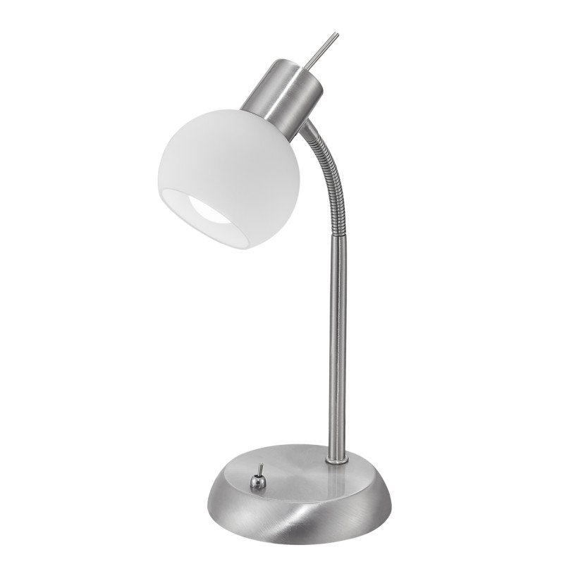 Lámpara de mesa portátil, con estructura de metal acabada en cromo y tulipa de cristal opal mate acabada en blanco. El casquillo de la bombilla es E-14 compatible con bombillas Led. Se puede usar también como flexo, incluye interruptor, es una lámpara moderna ideal para habitaciones, salon o dormitorio.