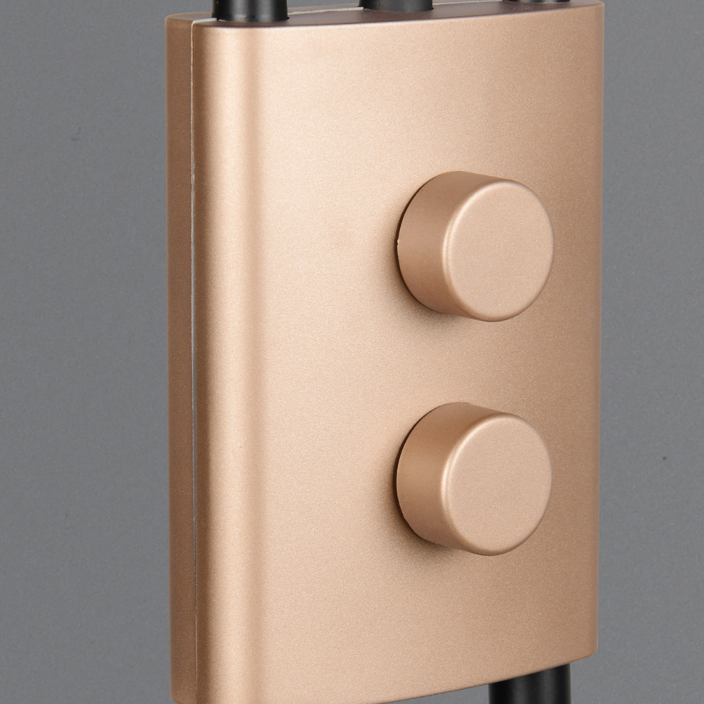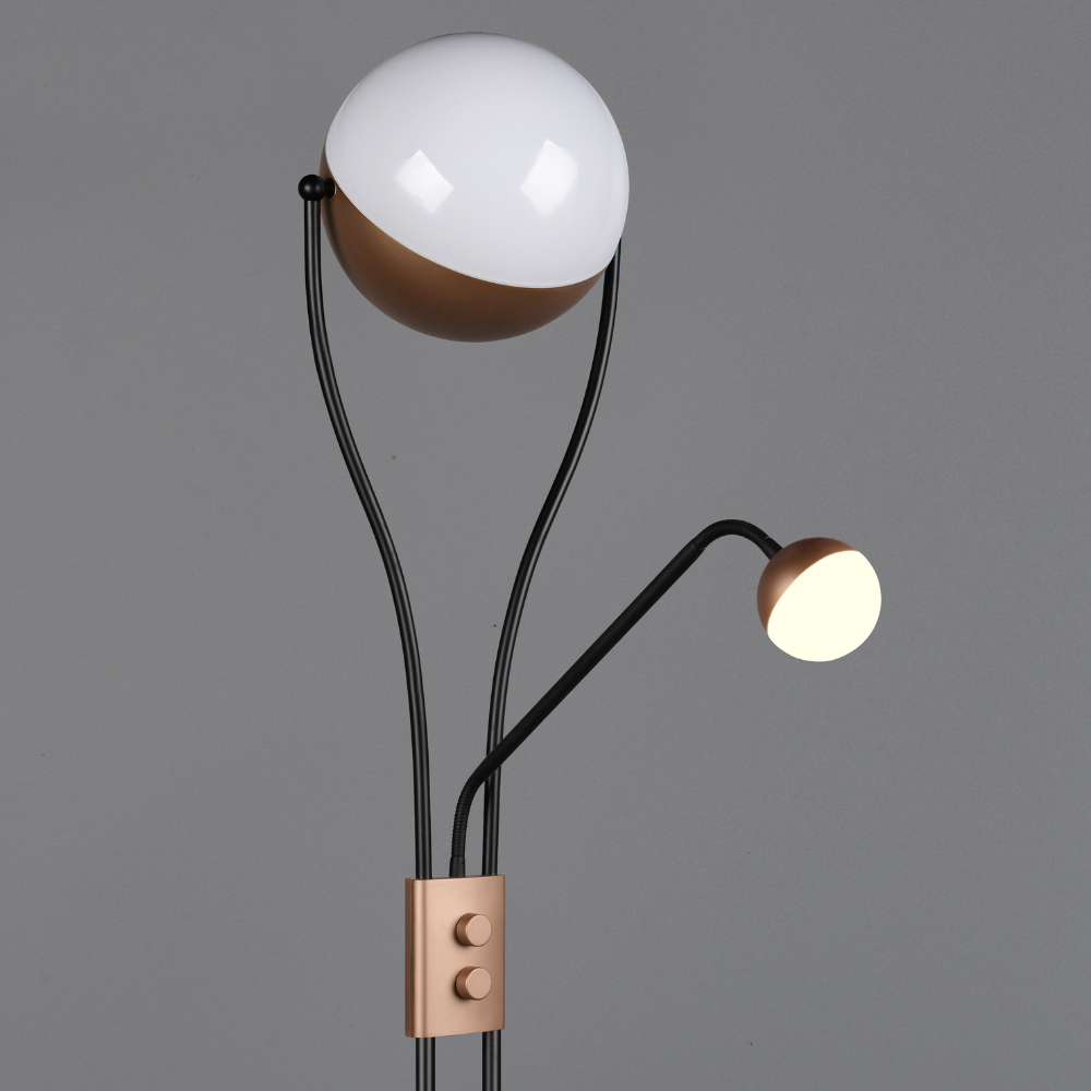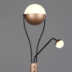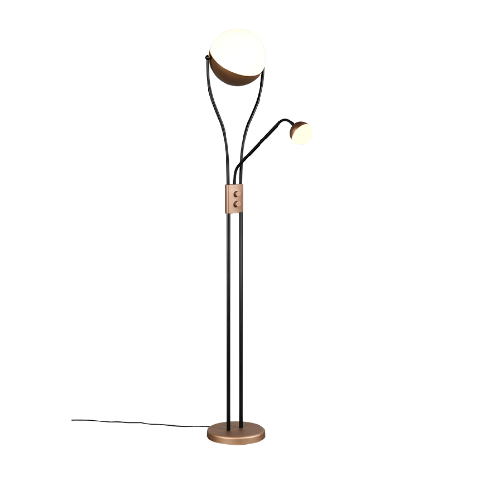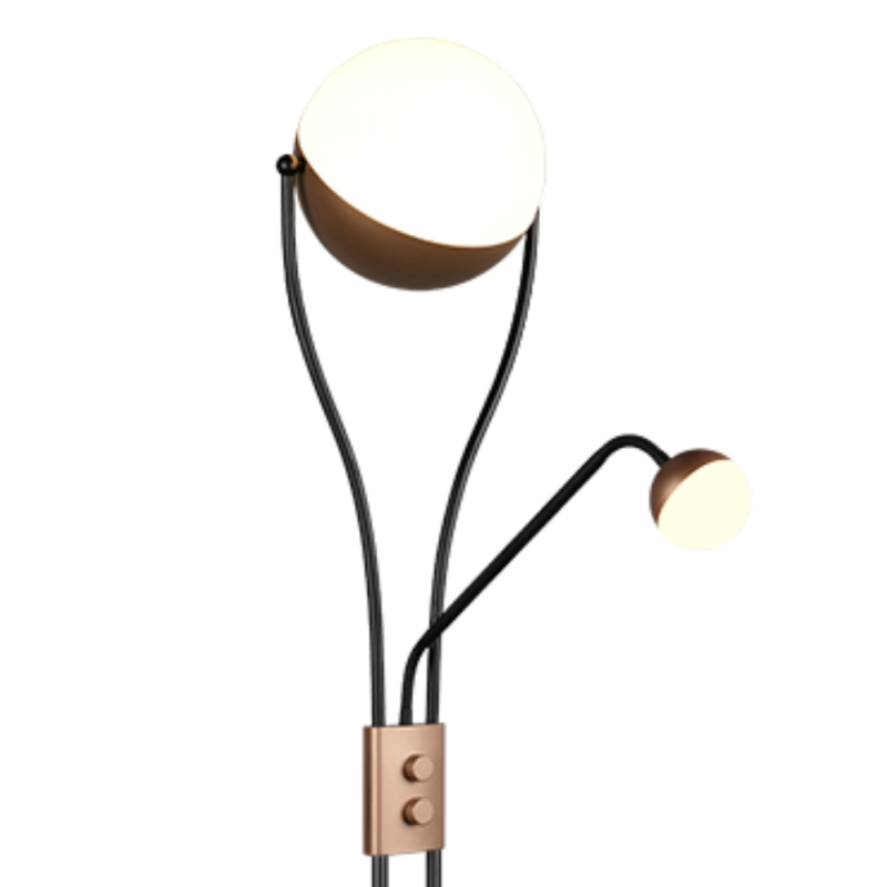 La lámpara de pie Chris tiene un diseño moderno y original. Su estructura es de metal en acabado negro con detalles en color cobre. Cuenta con dos fuentes de luz: una esfera principal con acabado opalino que proporciona iluminación ambiental con un consumo LED de 18w (2000lm) en una agradable tonalidad 3000k (luz cálida) y una segunda luz direccional más pequeña, ideal para lectura o iluminación focalizada con un consumo LED de 3.8w (350lm) en tonalidad cálida 3000k. Su brazo lector es orientable para focalizar el haz de luz hacia donde necesitemos. Sus dos luces son independientes una de la otra gracias a sus interruptores separados. También son regulables en intensidad mediante un regulador de luz integrado. Disponible en otros acabados.