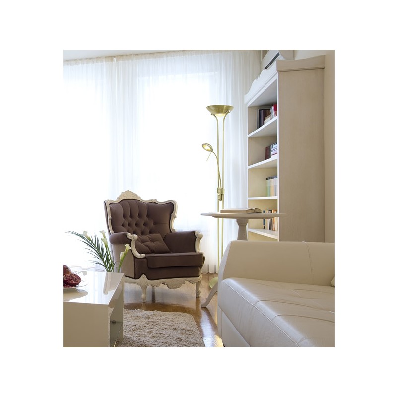 Lampara de pie en acabado cuero. tecnologia led incluida parte superior consumo de 18w (1700lm)y brazo lector 5w (480lm).Luz calida 3000k, regulable en intesidad.Ideal para utilizar como lámpara de lectura o de luz ambiente en un salón.
