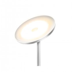 Lámpara de pie Denzel Gris CristalRecord con brazo lector, LED integrado 36W y 3.000 lm. CCT regulable, dimmable, con mando a distancia y temporizador 1 h. Modos: noche, bebé, lectura y trabajo. Medidas (ficha): alto 175 mm y Ø250 mm.