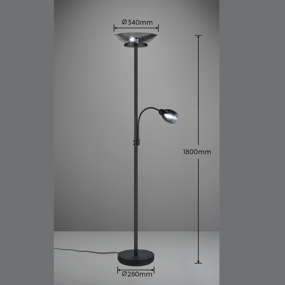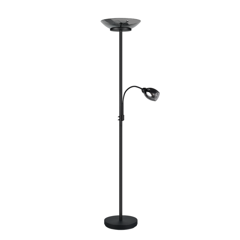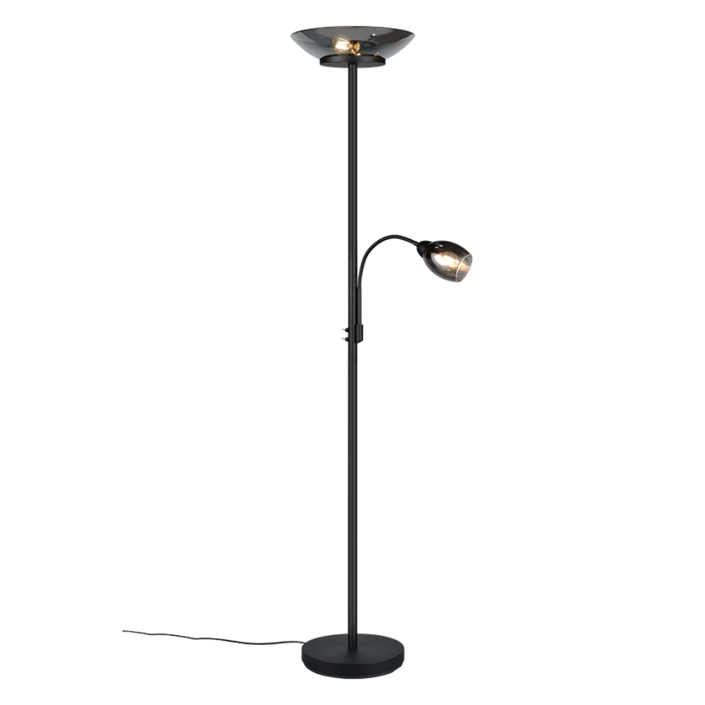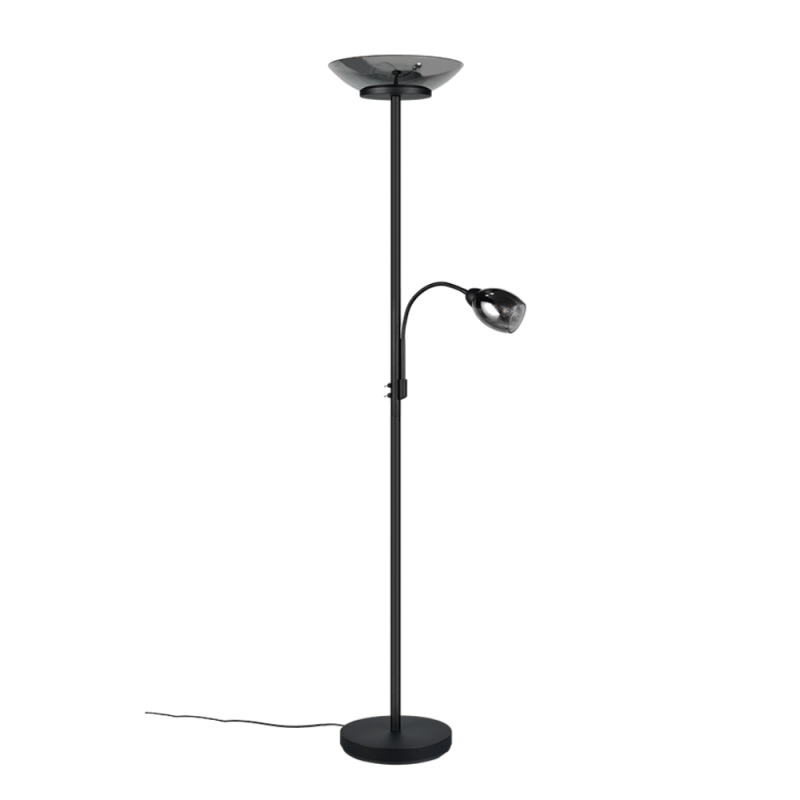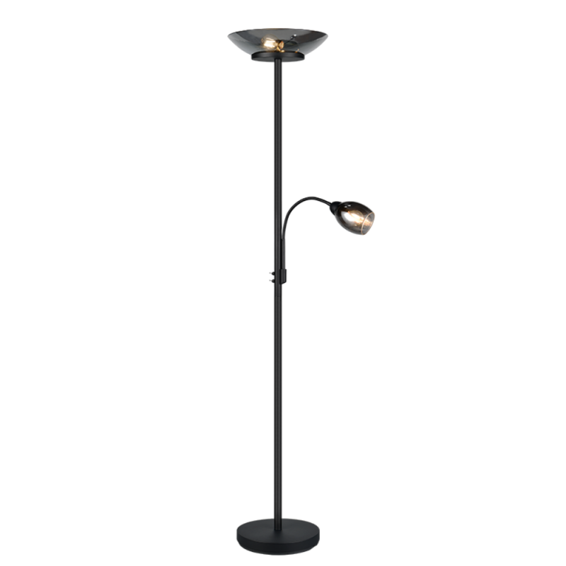 Lámpara de pie Gerry en negro mate con pantallas de vidrio cromo. Doble luz: principal + brazo flexible de lectura con encendidos independientes. 2xE27 (máx. 18W) + 1xE14 (máx. 10W), sin bombillas, IP20, Medidas aprox.: 180 cm alto, Ø34 cm.
