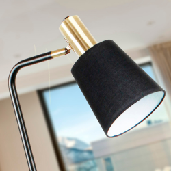 Lámpara de pie Schuller Gisela en metal negro mate con detalles en latón satinado y pantalla textil ajustable. Portalámparas E27 compatible con LEDs. Iluminación decorativa y elegante ideal para salones, dormitorio o rincón de lectura.