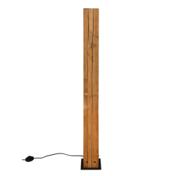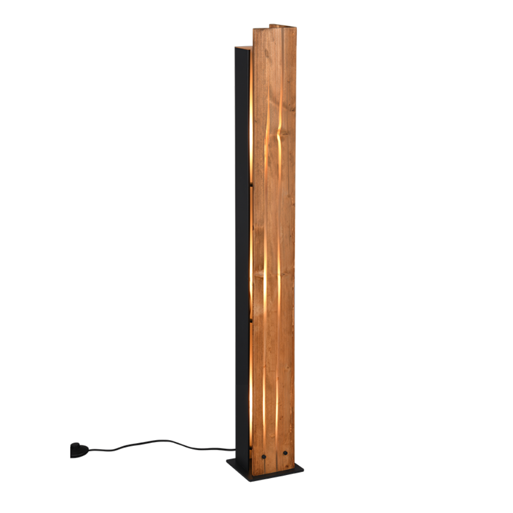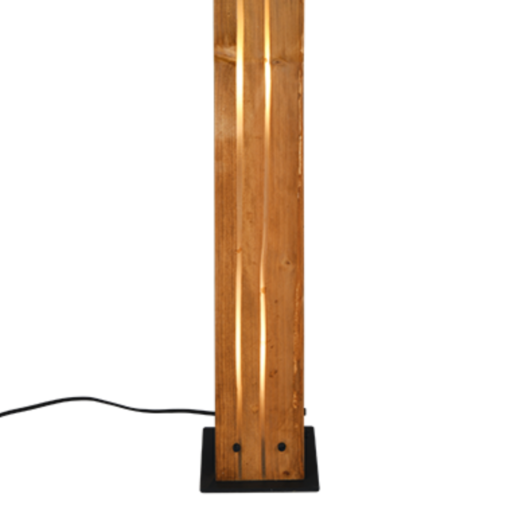 Lámpara de pie Karuni en madera natural y metal negro mate, con recortes decorativos que crean un efecto de luz envolvente. 3xE27 (sin bombillas) interruptor de pie, IP20. Medidas: 121 cm alto y base 16×16 cm.