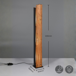 La lámpara de pie Karuni de TRIO Lighting aporta una estética cálida y contemporánea gracias a la combinación de madera natural y metal en negro mate. Su cuerpo presenta recortes decorativos que generan un atractivo juego de luces y sombras cuando está encendida, convirtiéndola en una pieza ideal para dar ambiente en salones, dormitorios, recibidores o rincones de lectura. Funciona con 3 bombillas E27 (no incluidas),es perfecta para usar con LED y conseguir una iluminación eficiente y confortable. Además, incorpora interruptor de pie, muy práctico para encender y apagar sin agacharse. Por tamaño, es compacta y fácil de colocar sin ocupar demasiado: 121 cm de altura y base 16×16 cm, encajando bien junto a sofás, butacas o en esquinas decorativas. Está diseñada para interior con protección IP20, ofreciendo seguridad y fiabilidad para el uso diario.