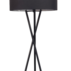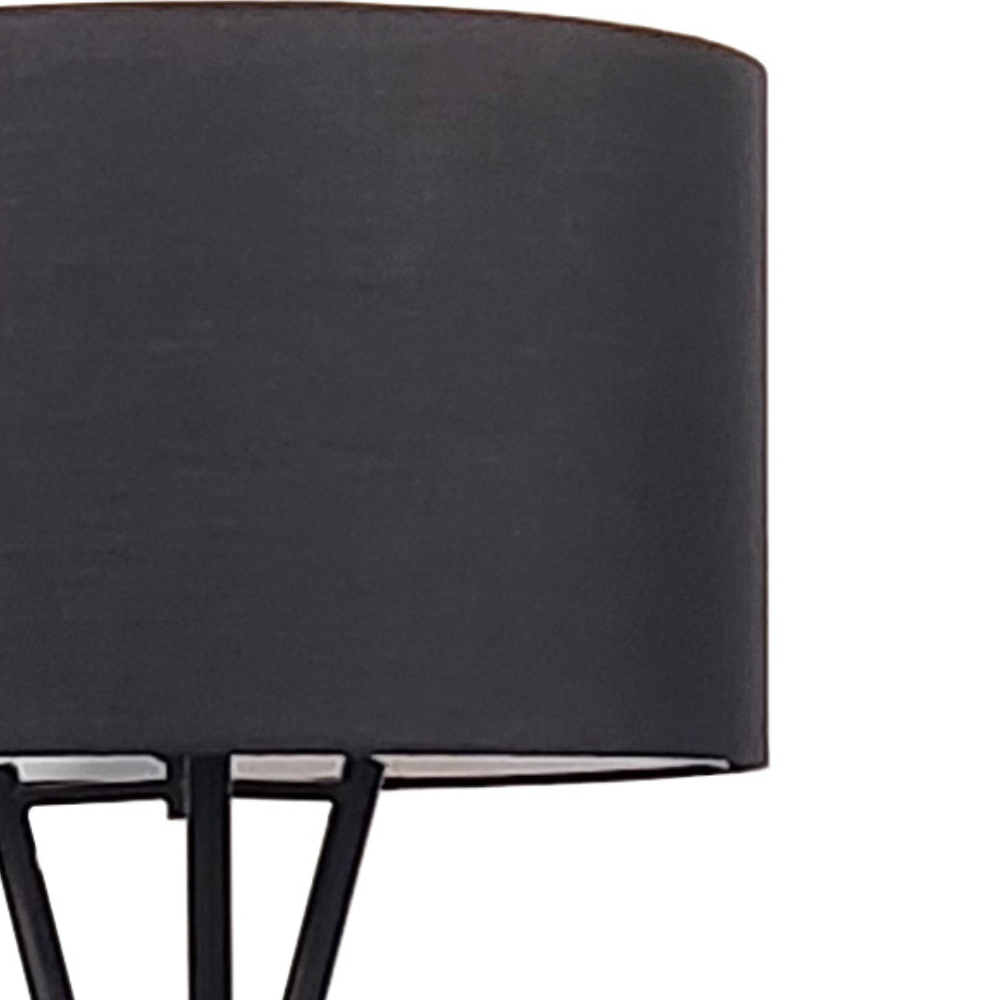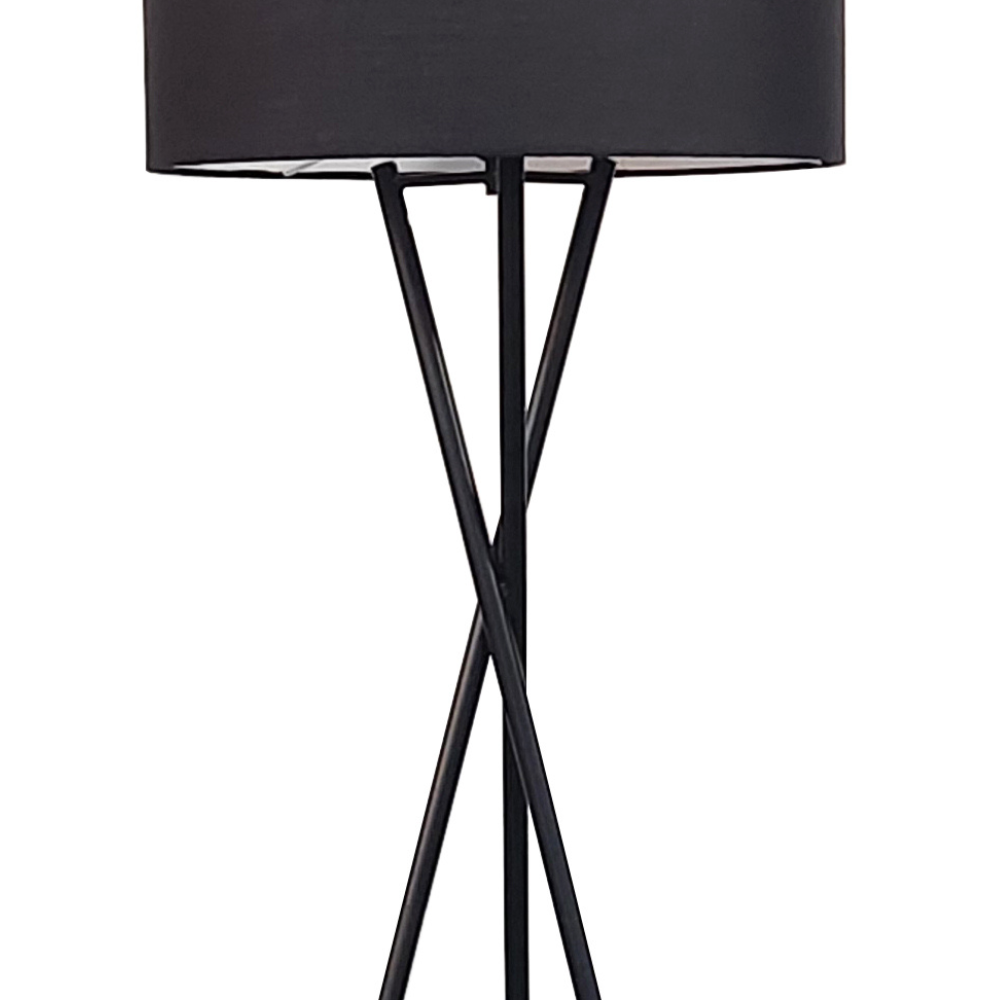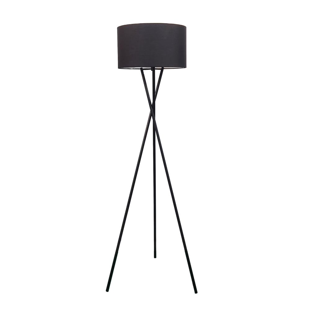 Descubre la lámpara de pie Naga, diseño moderno con estructura trípode en metal negro mate y pantalla de tela negra. Ideal para salones y dormitorios. Altura: 154 cm.