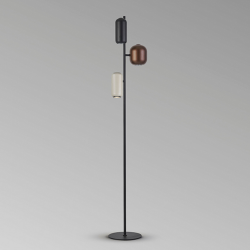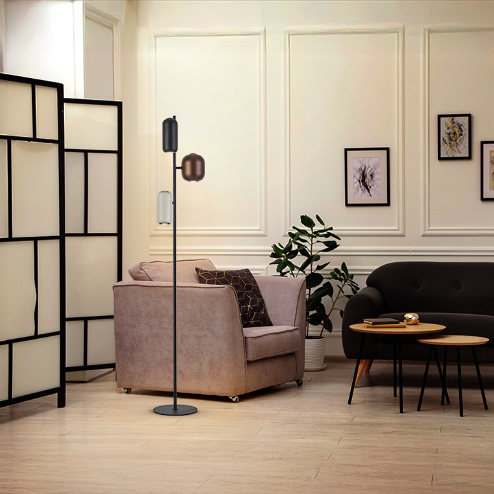 Lámpara de pie Schuller Nimes 3L en metal negro mate con tres tulipas orientables en negro, marrón y gris. Con portalámparas GU10 y diseño industrial moderno, ideal para iluminar salones, dormitorios o zonas de lectura con estilo.