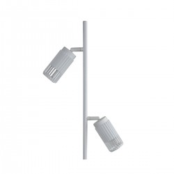 Lámpara de pie SAHARA en aluminio blanco arenado con 2 focos orientables. 2xGU10 (sin bombillas), máx. 10W, ideal para salón y lectura. Medidas: 1500 mm alto y Ø220 mm. 220–240V, Clase II.