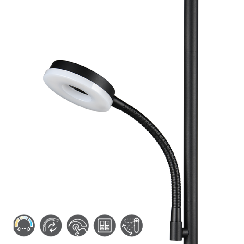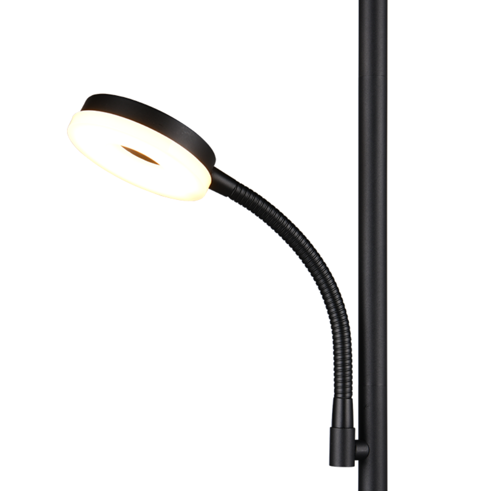 Lámpara de pie Spectre en negro mate con doble luz: uplight 17W (1900 lm) + luz de lectura 4,5W (450 lm). CCT 2700/4000/6500K, dimmer con sensor, luces independientes, cabezal orientable y brazo flexible. Altura aprox. 178 cm, base Ø25 cm (IP20)