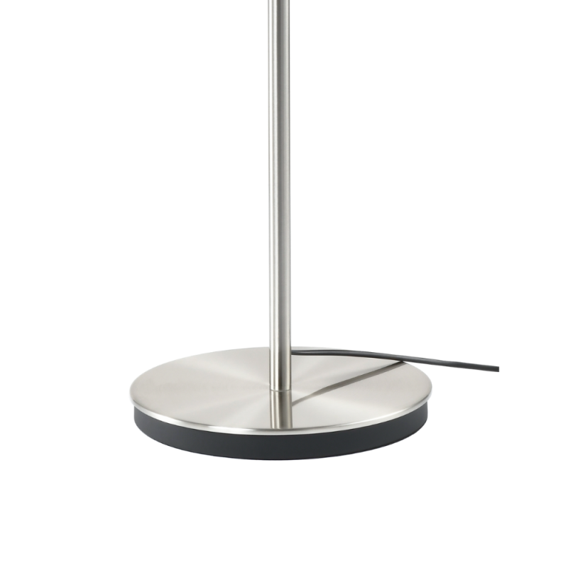 Lámpara de pie Tova con acabado en níquel satinado y base metálica elegante. Ideal para iluminar salones, dormitorios o zonas de lectura. Diseñada para bombillas E27, compatible con LED. Estilo moderno y estructura minimalista.