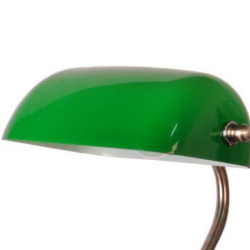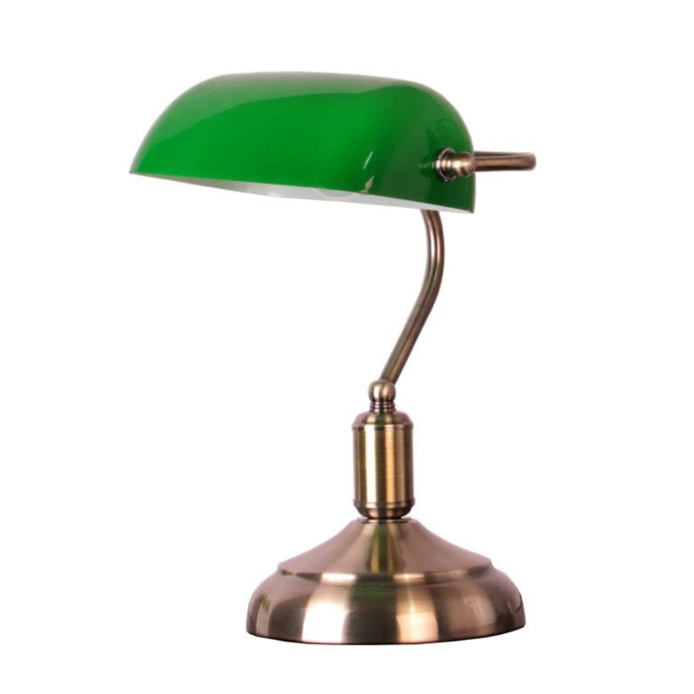 Lámpara de sobremesa Banquero con pantalla verde y base metálica dorada. Ideal para escritorio, despacho o zona de lectura. Compatible con bombilla E27 (no incluida). Diseño clásico, elegante y funcional.