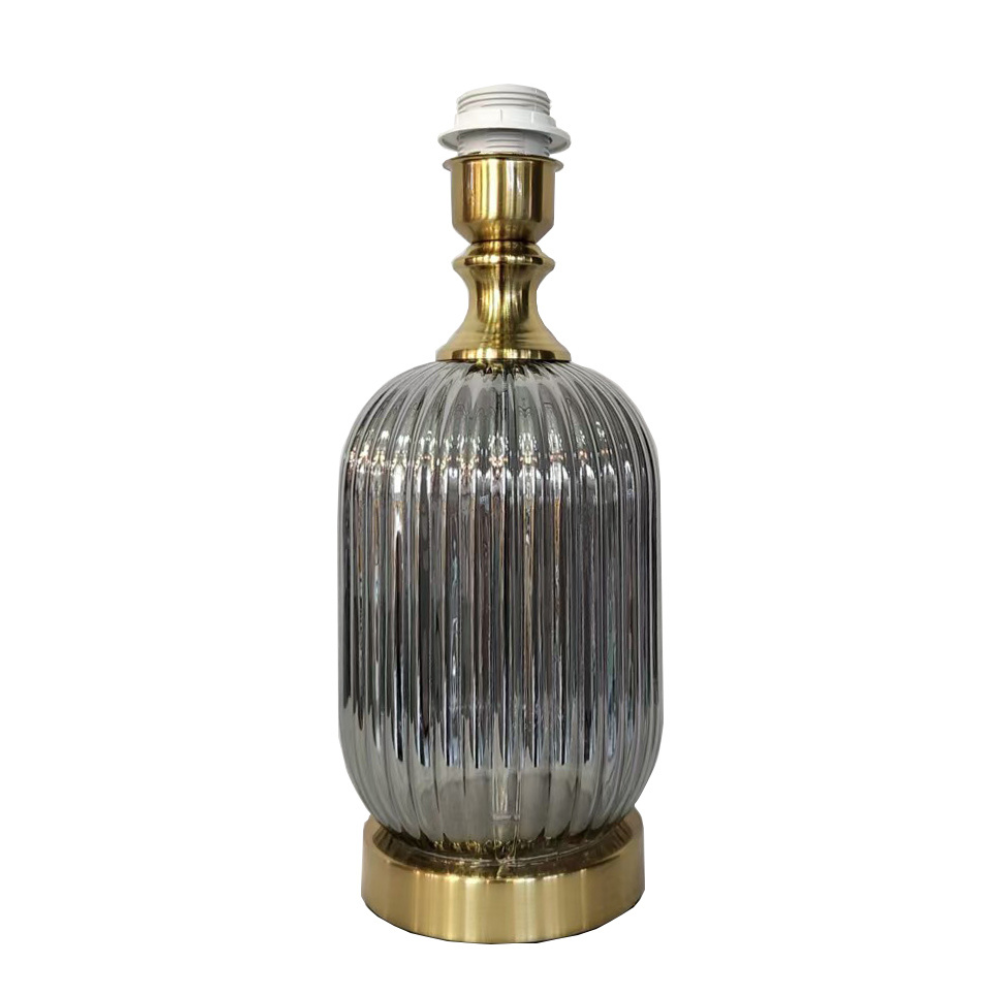 Lámpara sobremesa Indo 34 cm, metal cuero y cristal fumé. Diseño elegante sin pantalla. Apta para bombilla E27. Ideal para salas, mesas y dormitorios.