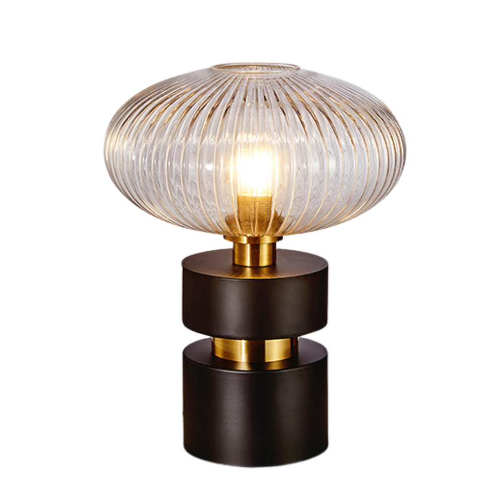 Lámpara de sobremesa Schuller Norma en negro mate con detalles en latón satinado y tulipa de cristal transparente. 1xE27 con LED 8W incluido, regulable, 870 lm. Medidas Ø30 x 38 cm , IP20.