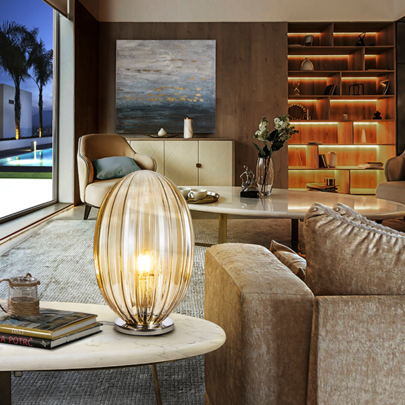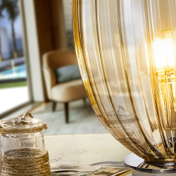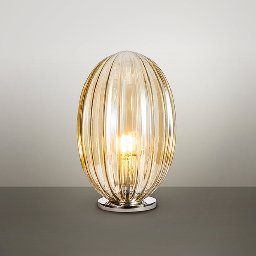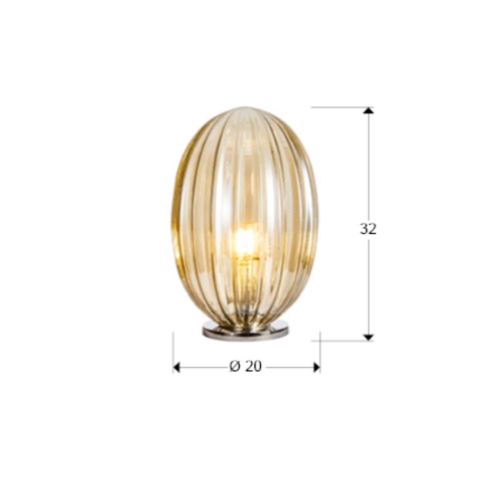 Lámpara de sobremesa Schuller Ovila en metal cromado con tulipa de cristal color coñac. 1xE27 con LED 8W incluido, regulable, 870 lm 2700K. Medidas Ø20×32 cm (tulipa Ø20×30 cm). IP20.